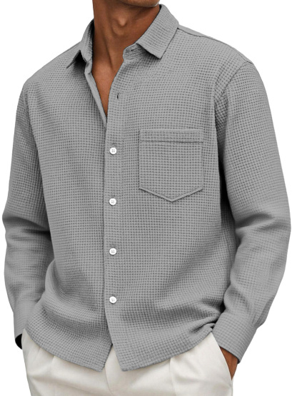 Men's Casual Solid Color Waffle Long Sleeve Shirt With Pockets